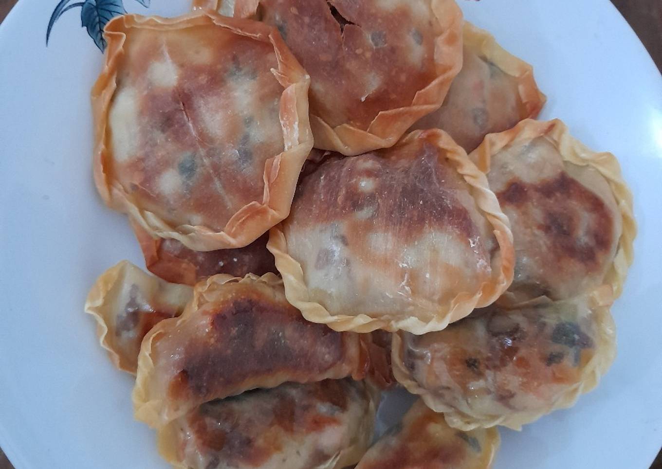 - Matikan api, kemudian campurkan daun bawang,kemudian bungkus dengan kulit pangsit