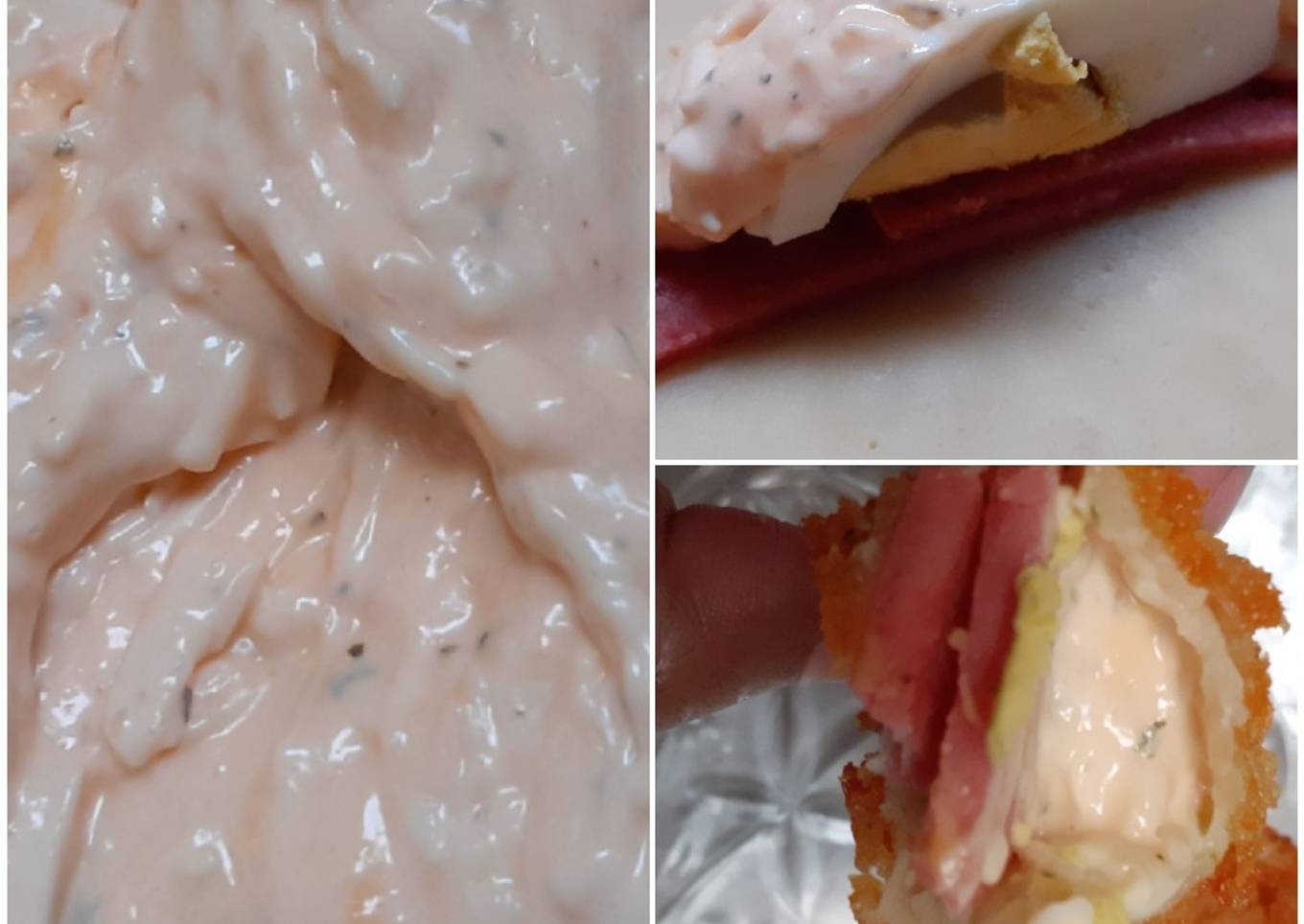- Campurkan mayonais biasa,mayonaise pedas,parsley +keju