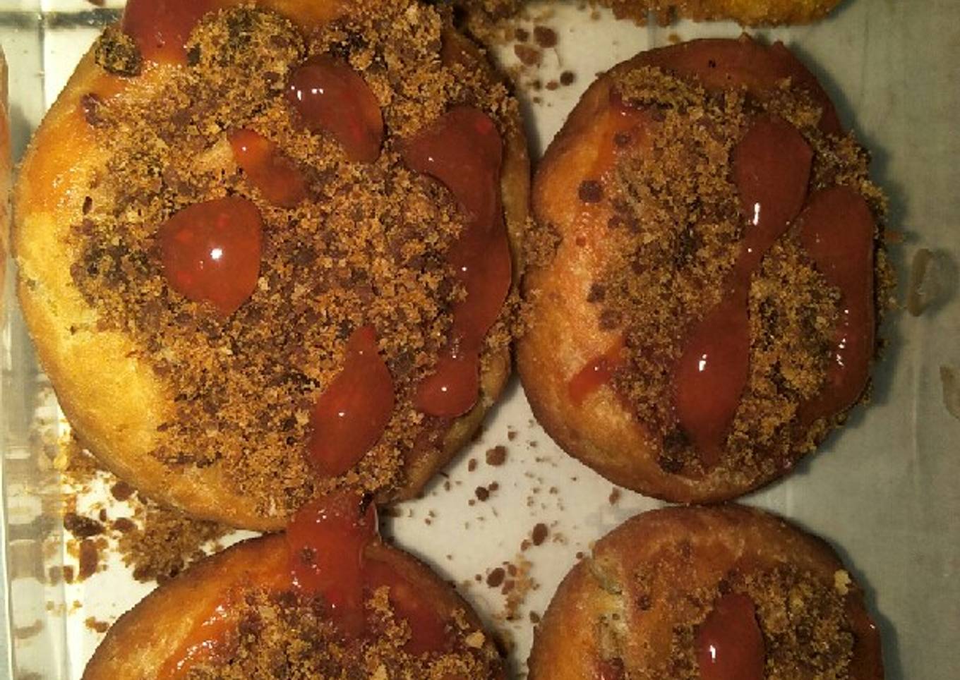 - Lalu beri topping sesuai selera, olesin mentega dulu lalu taburi abon dan saos/mayones. Donat siap disajikan